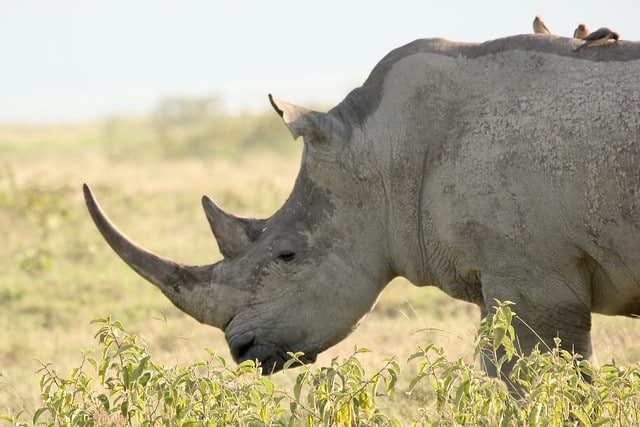Le rhinocéros vit presque toujours en relation symbiotique avec des oiseaux sur son dos. Il s’agit presque exclusivement du Bubulcus ibis, petit héron, et du pique-bœuf.
